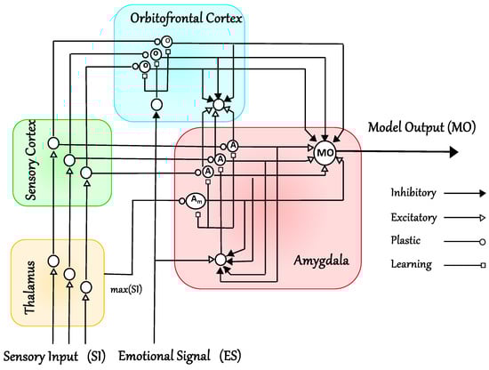 Brain Emotional Learning (BEL) is an intelligent methodology inspired by neurobiology [,,]. The BEL technique is developed based on the mathematical model of the emotional learning process determined in the mammalian limbic system [,]. Our adaptation builds upon the network model devised by Moren and Balkenius [] which emulates key regions such as the amygdala, orbitofrontal cortex, thalamus, sensory input cortex, and other pertinent areas associated with emotional processing. The BEL model utilized in this work, illustrated in Figure 2, comprises the orbitofrontal cortex and amygdala as its two primary components. Essentially, BEL serves as a mechanism for generating actions based on sensory inputs and emotional signals. The amygdala handles immediate learning, whereas the orbitofrontal cortex performs inhibitory actions to suppress any inappropriate learning occurring in the amygdala. Notably, the amygdala lacks the ability to unlearn any previously acquired emotional responses, highlighting the orbitofrontal cortex’s responsibility in inhibiting inappropriate reactions. The BEL model receives two pivotal external inputs: namely, emotional signal (ES) and sensory input (SI) [,,,].