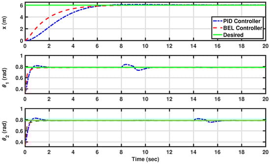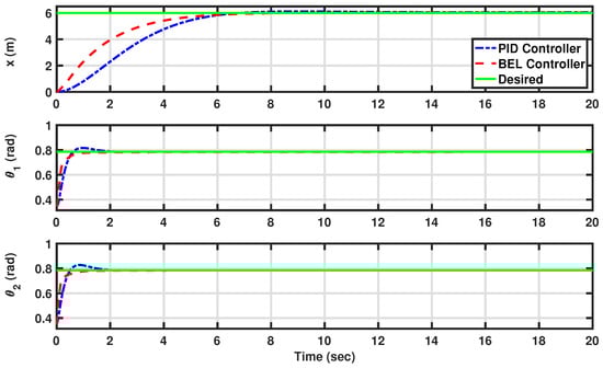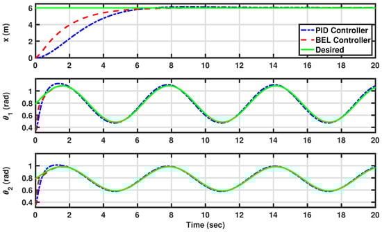 The desired and actual outputs of the system [the displacement (x) and the angles of the front and rear scissors ( and )] in constant trajectory tracking (see Scenario I: Maintaining constant trajectories for AV angles and displacement). The developed BEL-based controller is in red (dashed line), the PID is in blue (dashed–dotted line), and the desired trajectories are in green (solid line).
