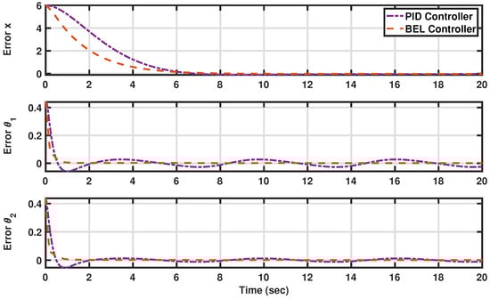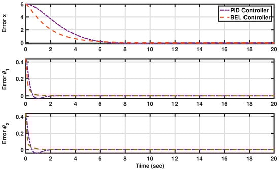 The tracking errors in tracking trajectories in the presence of substantial external disturbances (see Scenario III: Preserving AV angles and displacement in the presence of substantial external disturbances). The developed BEL-based controller is in orange (dashed line), and the PID is in purple (dashed–dotted line).
