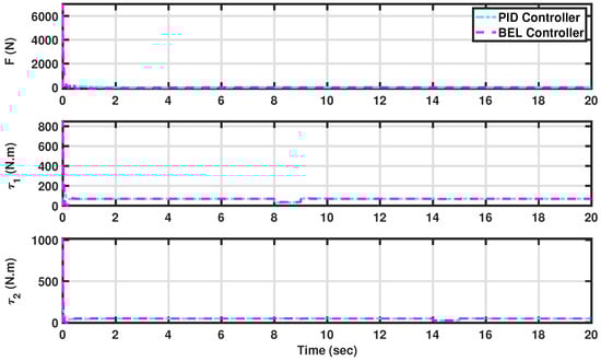 The generated forces and torques by both controllers in constant trajectory tracking (see Scenario I: Maintaining constant trajectories for AV angles and displacement). The developed BEL-based controller is in magenta (dashed line), and the PID is in cyan (dashed–dotted line).