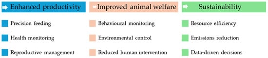 The integration of AI, ML, and automation in livestock farming can drive significant improvements in productivity, animal welfare, and overall sustainability (Figure 1). Enhanced productivity is achieved through precision feeding, where AI systems analyze data to determine the optimal feeding regimes for each animal, improving growth rates and feed efficiency. Health monitoring benefits from ML algorithms that predict and detect diseases early by analyzing patterns in behavior, temperature, and movement, reducing illness and associated productivity losses [35]. Additionally, automated reproductive management systems monitor cycles and detect optimal breeding times, improving reproductive success rates. Improved animal welfare results from behavioral monitoring, where AI tracks and analyzes animal behavior to identify signs of stress, discomfort, or illness, allowing for early interventions. Automated systems also maintain the optimal living conditions, such as temperature, humidity, and ventilation, reducing stress and promoting better health [23]. Furthermore, automation reduces the need for frequent human–animal interactions, minimizing stress and creating a more stable environment. Sustainability is enhanced through AI-driven systems that optimize resource use, such as water, feed, and energy, reducing waste and lowering the environmental footprint of farming operations [41,42]. Improved feed efficiency and health management also help to reduce methane emissions from livestock, contributing to lower greenhouse gas emissions. Comprehensive data collection and analysis enable more informed decision making, promoting practices that are both economically and environmentally sustainable [15,16].