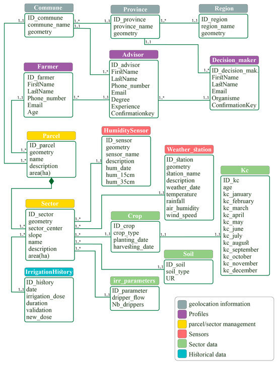 In the following section, “Materials and Methods” presents the methodological approach of the study. First, we define stakeholders, the selected specific crop, and the engaged irrigation system, illustrating a sophisticated needs analysis. After that, the architecture of the web-GIS platform ‘Soqia-Advice’ is detailed, and the database conceptual data model is presented.