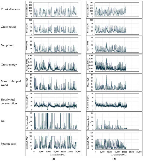 Comparing Figure 4a,b shows the differences between the original and final dataset. Beyond the number of acquisitions, in particular it can be noticed that the out-of-scale values of specific fuel consumption and specific costs, visible in Figure 4a in correspondence of very low or equal to zero values of diameter, disappeared in the diagrams of Figure 4b. It is the case, for instance, of the specific gross energy, which results from the ratio between gross energy and instant mass. In considering dataset III (Table 3), the mean diameter reported is 3.49 mm, which corresponds to an instant mass of 1.8 × 10−7 Mg. Assuming an instant power of 11 kW, multiplying this value by the acquisition time (0.2 s) provides an instant gross energy of 0.00061 kWh. The ratio between 0.00061 kWh and 1.8 × 10−7 Mg will provide the out-of-scale value of gross specific energy of 3370 kWh Mg−1. It can be noticed that this value is different from the 6502 kWh reported in Table 4. This is because the average values of the derived parameters in Table 4 were not calculated from the averages of the measured parameters reported in the same row of the table; rather, they represent the averages of all their instant values present in the respective datasets. Although not shown, similar behaviors were also observed for net specific energy and specific time, whose calculation requires the diameter to be present in the denominators of the relating formulas. In Table 3, they were not reported for dataset III. As to the other parameters reported in Figure 4: