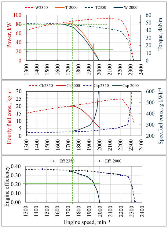 The green solid lines in Figure 5 indicate that the mean power of 25.1 kW, resulting in dataset V in Table 3, corresponds with an engine speed of around 1940 min−1 and a mechanical efficiency of around 0.21, similar to the value reported in Table 4. The diagrams indicate that the engine efficiency of the tractor ranges from 0 to a maximum of 0.37, in line with the data reported in the literature for tractors of a similar age [41], achievable under optimal engine working conditions (high torque, lowest fuel specific consumption), However, very far from those of our chipping test. Similarly, following the green dashed lines, a maximum efficiency around 0.335 can be assessed in Figure 5 (at engine speed of 1740 min−1 and fuel consumption of 20 kg h−1) based on the maximum gross power of 79.5 kW (Table 3) observed during the chipping (dataset V). According to Table 4, the maximum instant fuel consumption is 1.4 cm3. It should occur at maximum power demand and corresponds to an hourly fuel consumption of 20.16 kg min−1 (considering ti = 0.2 s and fuel specific gravity of 0.84 kg dm−3).