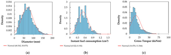 The non-normality of the variables is confirmed in Figure 6 by the frequency distribution of the values of diameter, D, instant fuel consumption, Fci, and gross torque, Tg, parameters directly measured by the sensor system. The positive skewness of the three distributions suggests the presence of a relationship between the trend of D and of Fci, and particularly of Tg. A similar trend was observed for the other parameters.