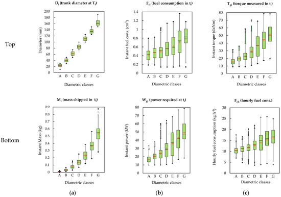 Despite the presence of outliers, the boxplots of Figure 7 and Figure 8 confirm the above observation and the results of previous studies [31] about possible relationships between the trend of diameters and other parameters, suggesting that at increasing diameters, the torque, instant and hourly fuel consumption, power, and energy increase as well, following quite linear trends. On the other hand, when the diameter increases, the mass, specific energy, specific mass, specific time, specific fuel consumption and specific cost show exponential trends, increasing or decreasing depending on whether the mass, Mi, is, respectively, in the numerator or denominator. In the formulae used to calculate these elements, the mass is the product of the specific gravity of poplar wood by the volume, Vi, of the virtual cylinder of wood chipped in ti. (Table 2, Formula (2)). Consequently, when Di increases, Vi increases more than proportionally, since it depends on the square of the radius and the height of the cylinder, which corresponds to the distance covered in ti by the trunk inside the chipper.