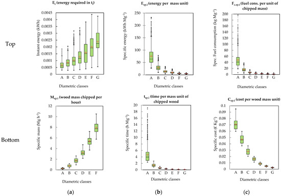 With reference to the results reported in Table 3, since the data provided by dataset III are negligible relating to those of the whole dataset (I), as said above, dataset IV and V were merged, for further analysis, into a final dataset that was considered significant for evaluating the performance of the chipper. The data of the twelve variables of Table 5 were grouped according to the following diametric classes: A: 10 < D < 30 mm; B: 30 ≤ D < 50 mm; C: 50 ≤ D < 75 mm; D: 75 ≤ D < 100 mm; E: 100 ≤ D < 125 mm; F: 125 ≤ D < 150 mm; G: D ≥ 150 mm. The resulting distributions are reported in the boxplots of Figure 7 and Figure 8. Figure 7 relates to the parameters, Di, Fci and Tgi, directly measured by the sensors (Figure 7, top), and to the basic parameters, Mi, Wgi and Fch, calculated from them, in real time, by the acquisition system (Figure 7, bottom). Figure 8 refers to six parameters, Egi, Egspi, Fcspi, Mspi, Tspi and Cspi calculated remotely by combining the previous ones to better characterize the quality of the chipping carried out. The twelve class distributions of Figure 7 and Figure 8 underwent ANOVA and Mann–Whitney pairwise tests, always resulting significantly different for the mean and median (p-value < 0.05).