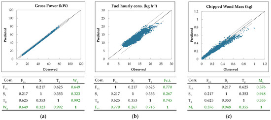 According to previous considerations, multi-linear MLR predictive models were developed for several variables based on the dataset IV and V of Table 3. They are reported in Table 6, which shows the formulas and relating statistics indices. The models were divided into two groups. The models of Group 1 were based on three independent variables: Fci (cm3), i.e., fuel instant consumption directly measured by the relating sensor, and Tgi (daNm), instant torque directly measured by the torque meter; Si (m2), i.e., instant section of the trunk being chipped, directly calculated by the acquisition system from the instant diameter. They were used to assess Wg (gross power, kWh), Fch (fuel hourly consumption, kg h−1); Mi (mass of wood chipped in ti, kg).