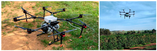 The use of unmanned aerial vehicles (UAVs), frequently referred to as drones, for the application of agricultural pesticides has increased significantly worldwide. It is a relatively new technology in many countries and little research data are available. Its use has grown significantly, but there is a lack of information to support more efficient application [6]. This technology uses a reduced spray volume, airflow, and higher heights relative to the plants, among other characteristics, which makes it more complex and requires better understanding, especially in perennial crops such as coffee.