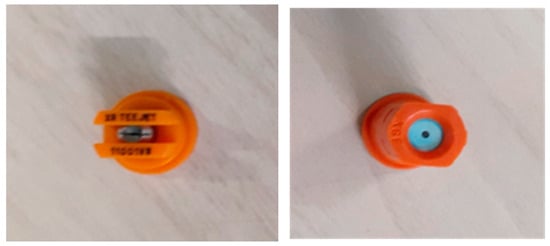 Spray tips used in the applications: flat fan XR 11001 (left) and hollow cone COAP 9001 (right).