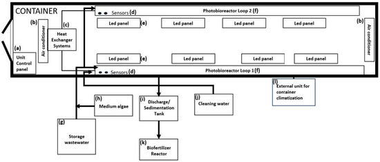 The main structure housing all components of the system, including (a) a unit control panel to monitor and control various systems within the container, (b) two air conditioners to provide temperature regulation, (c) a heat exchanger system to manage the temperature of the photobioreactors, (d) sensors to monitor environmental parameters, (e) LED panels to provide artificial illumination to support microalgae growth, (f) photobioreactor Loop 1 and Loop 2, (g) a storage wastewater tank, (h) a medium algae tank to store the culture medium, (i) a discharge/sedimentation tank for harvesting and biomass separation, (j) a cleaning water system to treat and clean water within the container, (k) a biofertilizer reactor to produce biofertilizers/biostimulants, and (l) an external unit for container acclimatization to control the internal climate conditions.
