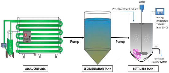 Illustration of the biostimulant production process. The algae cultures cultivated in the PBR are transferred to the sedimentation tank, where they settle and concentrate, effectively separating the algae biomass from the water. The concentrated algal culture is then pumped into the fertilizer tank, which processes it into biofertilizer. This tank is equipped with a stirrer, a heating system, and a temperature controller (max. 60 °C) to ensure optimal processing conditions.