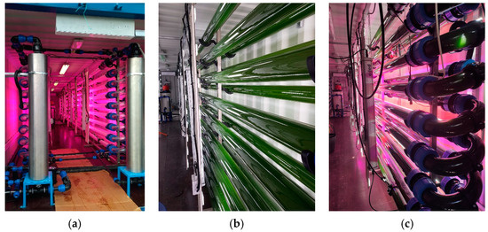 The agro-wastewater treatment plant is a containerized and automatically controlled system designed by STAM S.r.l. (Genoa, Italy) to treat different types of wastewater using closed photo-bioreactors. Compared to other microalgae cultivation methods, the system design is a versatile system that could also benefit from the use of an artificial lighting system. The design, components, and operational features of the treatment plant are illustrated in Figure 2.