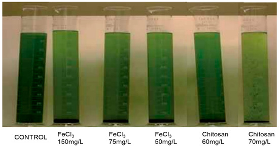 Based on the results, both chitosan and FeCl3 flocculants presented promising results regarding sedimentation. However, the doses were definitive in identifying FeCl3 as the most suitable substance at the maximum concentration (150 mg L−1) in terms of sedimentation speed (9.9 cm min−1) and biomass recovery (12.9 g L−1) of wet and pre-concentrated biomass, as compared to the rest of the tested doses (75 and 50 mg L−1). The biomass recovery results obtained from the addition of chitosan were relatively good, featuring suitable biomass recovery, with significant differences found after the comparison with the results obtained from the FeCl3 samples. However, in the case of the chitosan flocculant, lower sedimentation speed was recorded (5.1 cm min−1 at 70 mg L−1) (Table 2).