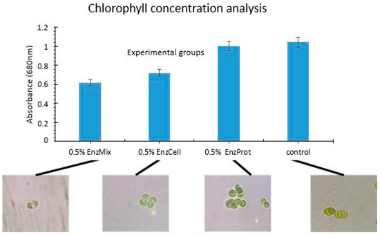 “EnzMix”, “EnzCell”, and “EnzProt” were added to 200 mL of culture at a ratio of 0.5% over the total volume of the assay and were exposed to agitation for 24 h to ensure an optimum breakdown of the cellular walls. Adjustments to the pH and temperature were made in accordance with the optimal operating conditions for each enzyme complex. Afterward, a visual measurement was performed through optical microscopy to evaluate the cellular degradation of the hydrolyzed sample. Moreover, samples were subjected to analysis of the chlorophylls present at 680 nm of optical density (OD680) under the assumption that broken cell walls cause photosynthetic systems to degrade while degrading the chlorophyll.