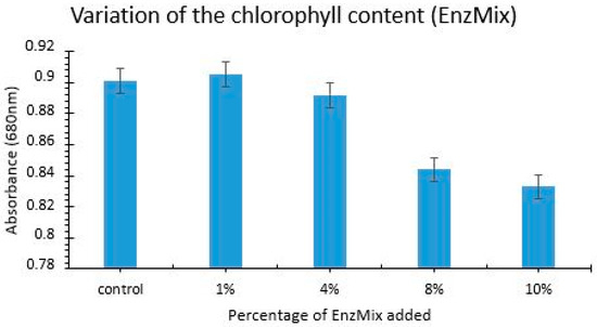 As shown in Figure 7, the initial chlorophyll measurement in terms of absorbance conducted on the control treatment sample was 0.918 at a maximum OD680. Moreover, the addition of 1% of the enzymatic complex “EnzMix” resulted in a slight, albeit not significantly important, increase in the absorbance level. This outcome could be attributed to the natural deviation of the selected measuring method rather than the influence of the hydrolytic activity on the culture sample. On the other hand, the addition of 4% of enzymatic complex “EnzMix” resulted in a non-statistically significant decrease in the OD680 values compared to the control treatment. However, the addition of 8% of the ”EnzMix” complex did not follow a similar trend to the other percentages tested, since its application resulted in a significant reduction in chlorophyll values, possibly due to the optimal interaction among substrate and enzymatic molecules. Finally, the addition of 10% of “EnzMix” to the Desmodesmus sp. culture also resulted in a clear, albeit slightly greater, reduction compared to that observed in the case of the 8% addition. Hence, the optimal concentration of the enzymatic complex “EnzMix” for the most effective biocatalysis process was found to be 10%, correlating with the biomass present. The reduction in chlorophyll absorbance readings was significantly higher when “EnzMix” was applied to Desmodesmus sp. culture at 10% concentration.