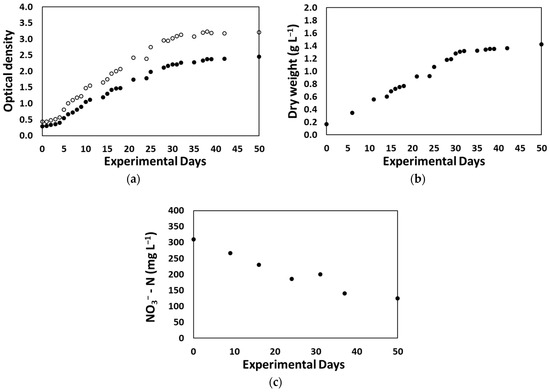 (a) Optical density at 750 nm (OD750, black dots) and at 680 nm (OD680, white dots), (b) dry biomass productivity (g L−1), and (c) nitrogen content (NO3−-N, mg L−1) in Desmodesmus sp. culture grown in open-pond bioreactor for 50 days.