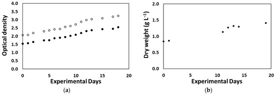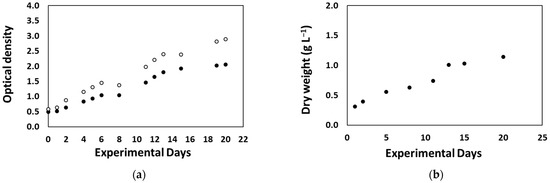 (a) Optical density at 750 nm (OD750, black dots) and at 680 nm (OD680, white dots) and (b) dry weight (g L−1) of the Desmodesmus sp. culture grown for 20 days in the open-pond bioreactor.