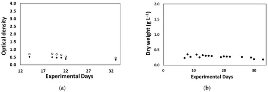 (a) Optical density at 750 nm (OD750, black dots) and at 680 nm (OD680, white dots) and (b) dry biomass productivity (g L−1) in the Desmodesmus sp. culture grown in the closed PBR for 33 days.