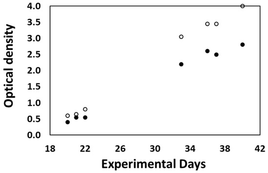 Optical density at 750 nm (OD750, black dots) and at 680 nm (OD680, white dots) in the Desmodesmus sp. culture grown in the open-pond bioreactor for 40 days using the biomass initially grown in the container.