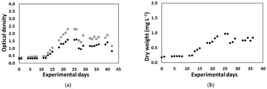 (a) Optical density at 750 nm (OD750, black dots) and at 680 nm (OD680, white dots) and (b) dry weight (g L−1) of the culture in the PBR system with CO2 infusion.