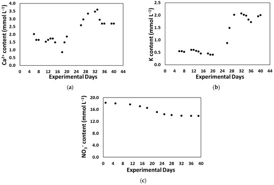 Black dots indicate the (a) Calcium, (b) potassium, and (c) nitrogen content (mmol L−1) in the Desmodesmus sp. culture in the PBR.