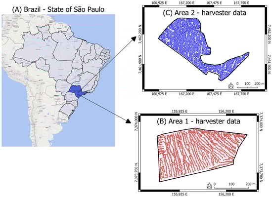 Study sites. (A) Country level (Brazil) highlighting the state of São Paulo. (B) Area 1 and (C) Area 2 of study.