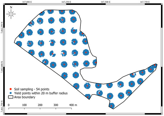 Soil sampling and Eucalyptus grandis yield points within a 20 m buffer radius.