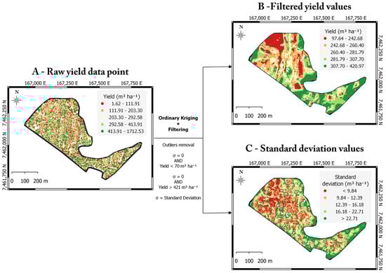 Eucalyptus grandis yield maps. (A) Raw yield data. (B) Filtered and interpolated yield data. (C) Standard deviation values.
