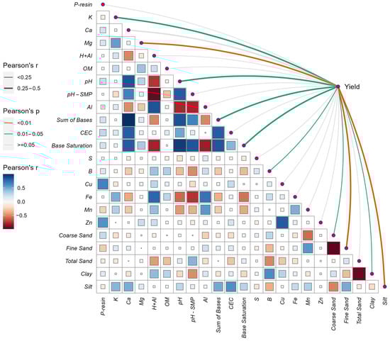 Correlogram among Eucalyptus grandis yield and soil attributes at 5% significance considering a 20 m buffer radius using the soil sampling as the reference point. Values within the cell represent Pearson’s r. Cross symbol (X) within the cell represents p-value > 0.05.