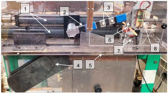 A high-speed impact tester was used in this study. It is in the department of Agricultural and Biological Engineering at the Pennsylvania State University and provided by the Idaho National Laboratory. It could be used to measure the dynamic shearing strength, power, and energy required to break a biomass sample. This device was used in this study to measure the cutting force. The front view of the high-speed impact tester is shown in Figure 1. The high-speed impact tester had a pneumatically accelerated swing arm (2) using pressurized air supply. The swing arm was made of aluminum and propelled by a rotary actuator to reduce the momentum. Its start point was a vertical position, and the structure allows it to spin near to a full 360° turn. The cutting mechanism was enclosed within a high strength acrylic glass cover for the purpose of safety. The pressurized air is accumulated in an air tank with a capacity of 40 psi, which was supplied with the compressed air pipeline system in the building. Different types of impact and cutting tools can be mounted on the swing arm for different studies. There are three magnets (3) embedded in the arm which help to slow down after a cutting trial.