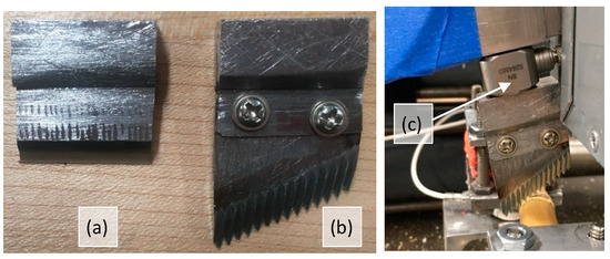 Two cutting blades, flat and serrated, were used in this study (Figure 2a,b). A loadcell was mounted between the cutting blade and the swing arm (Figure 2c). The apparatus has limited space when attaching a cutting tool. Thus, the size of the blade should be reduced. In addition, to reduce the effect of the blade momentum on the cutting force, the blade was minimized. The serrated blade was modified from a commercial blade to mount the loadcell and fit the limited space in the device.