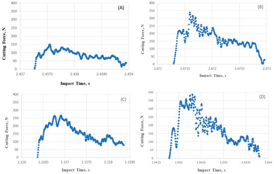 Using the flat blade as an example, four typical force–time characteristics of a complete cutting process at the internode and node for lower and higher portions of the plant using different support methods are demonstrated in Figure 6. The average time of cutting through a stem was 0.0019 s. In most cases, the cutting time for an internode sample was longer compared to the time of cutting at a node as shown in Figure 6A,D. This was most likely due to the more fragile nature of the node than internode. Thus, the impact time for a node section was less than the internode section even though the nodal section was stronger than the internode section for Miscanthus [12]. Other cutting blade and support methods had a similar pattern with the flat blade.