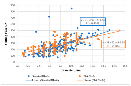The calculated specific cutting forces in Table 1, Table 2, Table 3 and Table 4 were used to examine the relationships between the cutting forces and plant stem diameters. Thus, all cutting data used in Table 1, Table 2, Table 3 and Table 4 were separated into two cutting blade groups. Statistical analysis was conducted to test the interactions between the specific cutting forces and stem diameters for each cutting blade. A positive relationship of Miscanthus stem diameter was found on the cutting forces for both flat and serrated blades, as shown in Figure 7. The peak cutting forces presented an increased trend when the stem diameter became larger. It seems that the cutting forces of the serrated blade were more sensitive to the stem diameter than those of the flat blade because the increasing rate (51.7%) was greater than the rate of the flat blade (38.5%) even though these trends were not statistically significant.