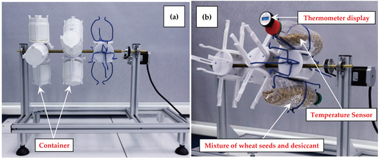 Photos of an automatic mixing unit for contact drying: (a) holders with installed containers and (b) containers with a mixture of wheat seeds and a desiccant, equipped with a resistance thermometer.