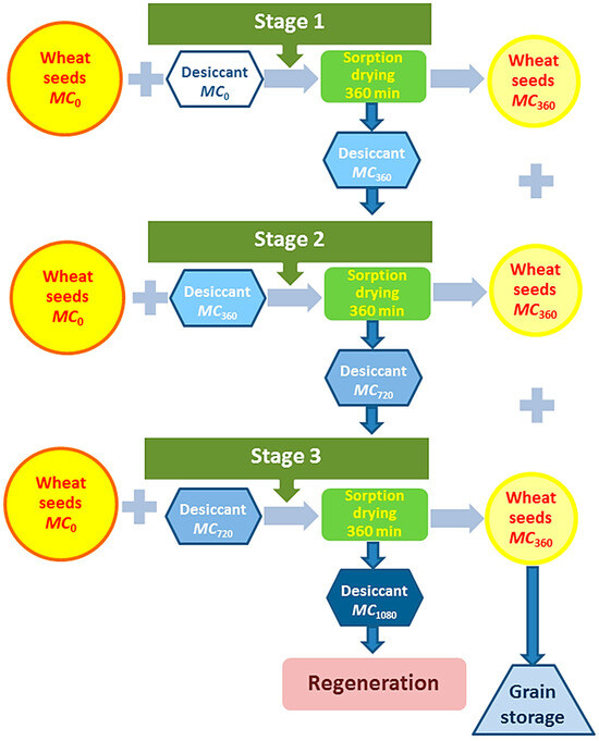 To determine the possibility of reusing the desiccant until it was completely saturated with moisture without intermediate regeneration, sequential contact drying of three batches of wheat seed was conducted. The three-stage sorption drying process scheme is shown in Figure 2. The desiccant/grain mass ratios were 1:1 and 1:2. The contact drying time for each wheat batch was 360 min.