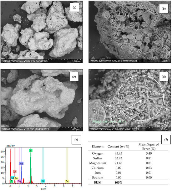 SEM images and energy dispersive spectra of desiccant granules: (a) general view; (b,c) individual granule; (d) internal structure at a granule fracture; (e) energy-dispersive spectrum for the granule shown in part (c) of this figure; and (f) composition of the indicated area shown in part (d) of this figure. The element content, normalized to 100%, and the determination error are given.
