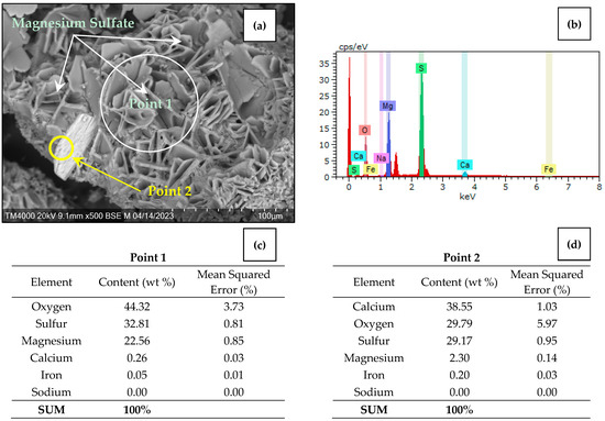SEM image of a single desiccant granule (a), the energy-dispersive spectrum for this granule (b), and the composition of the indicated areas Point 1 (c) and Point 2 (d) shown in part (a) of this figure. The element content, normalized to 100%, and the analysis error are given.