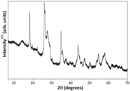 An XRD pattern of the initial desiccant sample is shown in Figure 5. It is known [57] that blurred lines in X-ray diffraction patterns are characteristic of amorphous substances, defective crystals, and small crystallites. In the case of the kieserite sample under study, the wide peaks in the XRD pattern (Figure 5) were associated with distortions and defects of small magnesium sulfate crystallites forming a cellular structure (Figure 3c,d and Figure 4). The crystal structure of the initial desiccant is not identified in the ICDD PDF database [51].