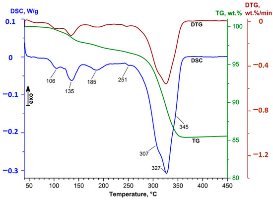 At temperatures of 400–450 °C, the desiccant was represented by the anhydrous salt MgSO4. The multi-stage nature of the observed process was indicated by the multimodal nature of the complex endothermic peak on the DSC curve and symbatic DTG curve. The main component (contribution of approximately 80%) of the complex DSC peak with the main maximum at 327 °C was observed in the temperature range of 250–400 °C and corresponded to the most strongly bound crystallization water in MgSO4∙1.14H2O. The presence of minor components at temperatures of 106, 135, and 185 °C of the complex DSC peak in the temperature range of 40–250 °C with a mass loss of 3.43 wt% (weakly bound crystallization water) was due to the ability of MgSO4 to form a series of crystalline hydrates MgSO4∙nH2O, where n ranged from 1 to 11 [40]. The temperature at which the last water molecule began to separate was 143.2 °C.