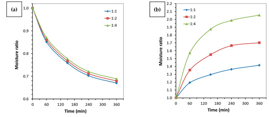 The moisture ratio changes of the grain dried in contact with the desiccant are shown in Figure 7a. Initially, moisture removal was rapid, but, as drying progressed, the rate of moisture removal slowed down at all tested desiccant/grain mass ratios. This may have been due to the fact that loosely bound moisture could be quickly released from the sample. The diffusion of moisture from the interior of the grain to the surface limited the drying rate. Desiccant moisture saturation increased with decreasing desiccant/grain mass ratios (Figure 7b).