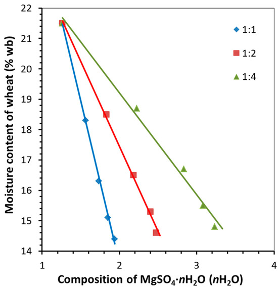 Relationship between the composition of the crystalline hydrate MgSO4·nH2O and the wheat moisture content during contact drying at various desiccant/grain mass ratios.