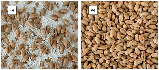 Standard germination tests [54,55] are commonly used to assess the viability of seeds after various post-harvest treatments. It is known that when seeds are heated, depending on the initial MC and the duration of heat treatment, a deterioration in their quality is observed [11,17,20]. Several studies [7,59] have reported that for good seed germination, the maximum recommended drying temperature for wheat should not be higher than 40 °C.