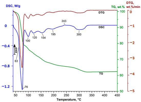 As a result of the contact drying of the wheat, the desiccant sample was saturated with water in a state corresponding to the gross formula of the crystalline hydrate MgSO4∙4.07H2O, with a total weight loss of 37.83 wt% (Figure 10). According to the DSC/DTG dehydration curves of the “saturated” desiccant, it was clear that, compared to the initial one (Figure 6), there was a significant change in the complex DSC peak, accompanied by a significant increase in the contribution of low-temperature components: mainly components at 76 °C and, to a lesser extent, at 100, 120, 154, and 195 °C. The predominance of the contribution of low-temperature components was associated with a significant increase in the proportion (about 91%) of weakly bound water in the crystalline hydrate MgSO4∙4.07H2O compared with MgSO4∙1.14H2O. The most strongly bound crystallization water is presented on the DSC/DTG curve as a broad peak in the region of 260–330 °C, with a maximum at 303 °C. The temperature at which the last water molecule began to separate was 142 °C.