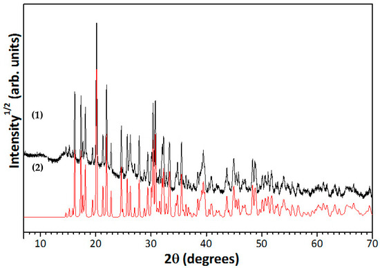 XRD patterns of desiccant after three-stage sorption drying of wheat seeds at a desiccant/grain mass ratio of 1:2. (1)—experimental, (2)—calculated.