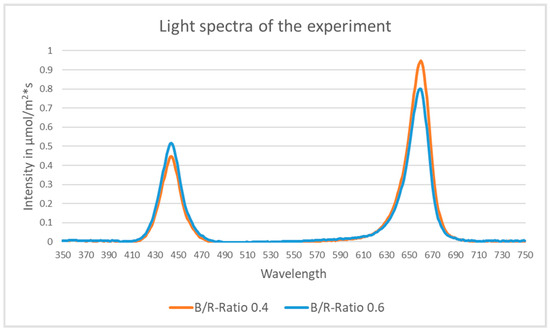 Eight pots were randomly distributed under two Mobile LED Racks by Rhenac GreenTec AG (Rhenac GreenTec AG, Hennef, Germany), resulting in four pots per rack. These LED racks emit variable light spectra in the range of 395–750 nm with a maximum photon flux density of 500 µmol·m−2·s−1. The light intensity for this experiment was adjusted with a quantum sensor (LI-190R; LI-COR Environmental GmbH, Bad Homburg, Germany) to 300 µmol·m−2·s−1 of artificial LED light consisting only of blue and red light. The peaks of the light spectrum were 445 nm for the blue LEDs and 660 nm for the red LEDs, as adjusted with the BLACK-Comet-HR Spectrometer by StellarNet (StellarNet, Inc., Florida, United States of America). A total of 12 h of daylight was given to the plants, resulting in a daily light integral (DLI) of 13 mol·m−2·d−1. The two artificial-light spectra were adjusted to blue-to-red ratios of 0.4 for the first rack and 0.6 for the second one (Figure 1).