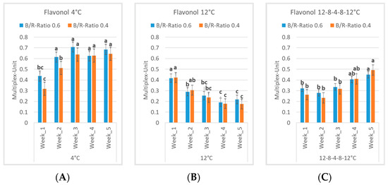 Flavonol contents in Multiplex-Units for the two light spectra (B/R ratio of 0.6 and B/R ratio of 0.4) and the three experimental procedures (4 °C (A), 12 °C (B), and 12–8–4–8–12 °C (C)) over the weeks with their standard deviation and their groups within the experimental procedures. Different letters indicate significant differences among the weekly measurements (p < 0.05).