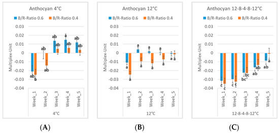 Anthocyanin contents in Multiplex-Units for the two light spectra (B/R ratio of 0.6 and B/R ratio of 0.4) and the three experimental procedures (4 °C (A), 12 °C (B), 12–8–4–8–12 °C (C)) over the weeks with their standard deviation and their groups within the experimental procedures. Different letters indicate significant differences among the weakly measurements (p < 0.05).