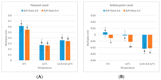 The results show the clear influence of temperature on flavonoid quantity. Changes in the contents of flavonols and anthocyanins over five weeks were detected in all temperature experiments. The influence on these substances according to the spectrum was also noticeable in all experiments. In general, the contents of flavonols and anthocyanins were elevated under blue-dominant light. The effect of the photoreceptors under UV and blue light promoting flavonoid biosynthesis explains these results and shows the impact of differences in light spectra in experiments [22]. Especially, anthocyanin accumulation is increased under blue light conditions [32]. Further, the direct influence of light spectra stress conditions also increases the accumulation of flavonoids to protect plants from light damage [33]. Temperature change can also be considered a stress condition, and so can its frequent change. Changes in phenolic compounds due to temperature changes have been reported for different plant species. Secondary metabolite accumulation as a result of environmental stress can explain the increased content until a balanced state is reached [34]. In all the experimental procedures, measurements of higher anthocyanin content for the 0.4 ratio were exclusively present in the last two weeks of the switching temperature experimental procedure. Because of the increased content of anthocyanins compared with the blue-dominant light spectrum elevated proportions of red light seem to increase stress conditions for the plants at rising temperatures. Temperature changes in general seem to cause increased stress, since the anthocyanin levels of the two experiments at constant temperature showed relatively stable levels from week three to the last week. Certainly, the plants in the switching temperature experiment showed the highest means of anthocyanin contents under the three temperature regimes. Interestingly, the accumulation of anthocyanin content started around one week later than in the other experiments. The identification of that fact and the opposite development at the end of this experimental procedure suggest that more stress is induced by increases in temperatures after cold periods. The plants in the 4 °C experiment under blue light conditions showed the highest anthocyanin contents, confirming the previous assumptions of increased accumulation under conditions of lower temperature and increased blue light [30].