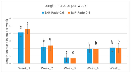 Means of length increase for the two light spectra (B/R ratio of 0.6 and B/R ratio of 0.4) over the weeks with their standard deviation. Different letters indicate significant differences in mean length increase per week (p < 0.05).
